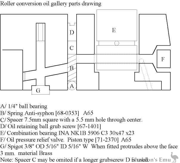 This drawing gives a list of the parts required for the oil gallery conversion. A change to the A65 type of anti-syphon setup where the ball bears on the back of the oil pump is superior.