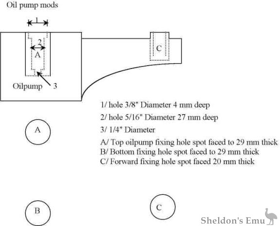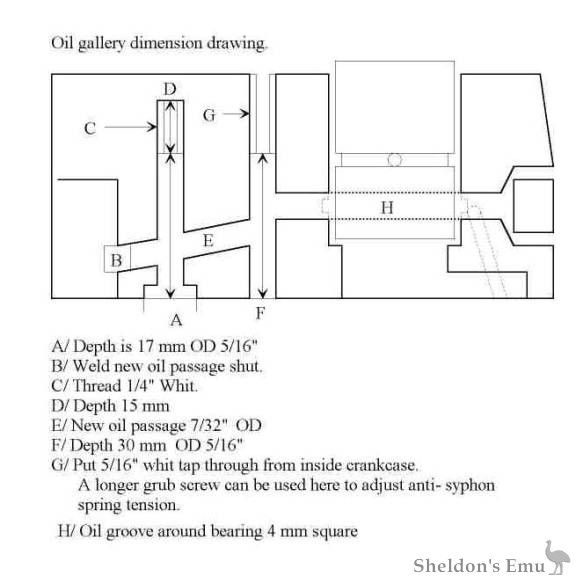 Well that's it. I think I have covered everything and if I haven't I expect I will hear about it real soon! Ok I suppose now is the time to tell you there is a simpler conversion that does not require any alterations to the oil galleries except putting in the groove around the main bearing. If you drill a hole from the outlet of the oil pump into the top fixing hole then no modifications to the galleries is required as the oil is split off in the pump and feeds the crankshaft end feed bridge. An anti-wet sumping valve would be a good idea. I personally don't like this setup. But many people do and run this conversion successfully here in OZ. You can use the A65 part of the oil gallery conversion, were the anti-siphon ball bears on the back of the pump if you want.