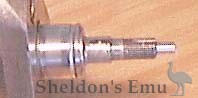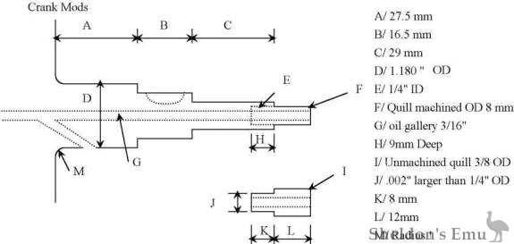 The crankshaft is machined to a diameter of 1.180 inches [the same size as the Drive side] all the way to the web leaving a small radius. The threaded part of the crank is machined to a length of 29 mm measured from the end of the crank to 1st step.A 3/16'' hole is SLOWLY drilled through the end of the crank till it breaks into the original oil gallery. Then a 1/4'' hole 9mm deep is drilled to accept the quill. The S/S quill is 20 mm in length with a 3/16'' hole through the center. There is a 8mm section with an OD of .002''larger than ¼'' which is pressed into the end of the crankshaft. The rest of the quill is 3/8'' OD un machined. The crank must be well supported when pressing the quill home. After the quill is pressed home it is machined to a final OD of 8 mm. From the end of the quill to the 1st step is 12 mm.