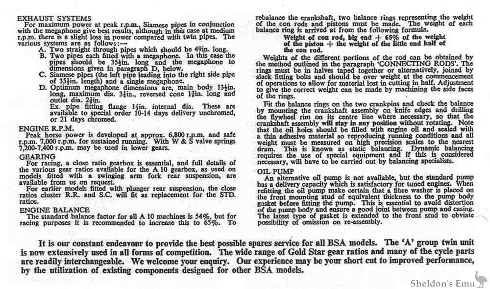 MANY changes have taken place on the A10 engine since its introduction for the Gold Flash in 1950, with a steady improvement ia power output, culminating in the Rocket Gold Star manufactured in 1962 which produced 50 b.h.p. The R.G.S. is already tuned to a high degree and the object of these is notes to help owners of older models to obtain an improved performance. It is not advisable to increase the power output from a very old engine, especially if it is proposed to use the machine for racing purposes, because the possibility of fatigue failure of the more highly stressed components.
