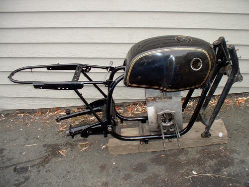 I picked up this bare frame in the spring of 2003 from a friend and fellow parts-swapping Airhead enthusiast in Southern California, when I was looking for a chassis for a cafe racer conversion, using a double disc brake front end with a billet upper triple clamp and a braced rear swingarm I had acquired on eBay. Since I had abandonded my first attempt at a cafe conversion on my R75/7 and returned it to stock, I thought a "frankenbeemer" with nonmatching frame and engine numbers and parts from many motorcycles would be more suitable for experimentation than my rarest Airhead. I wanted to start with a /7 frame because in stock condition, it is better braced and has bigger strengthening gussets than the frames of the earier /5 and /6 series. I wanted to create a rigid handler.
