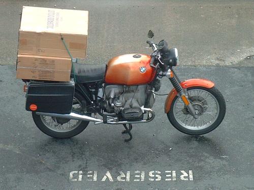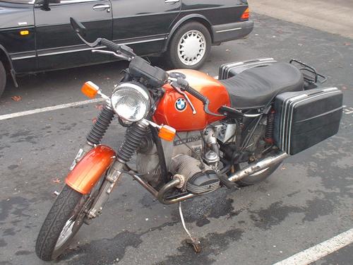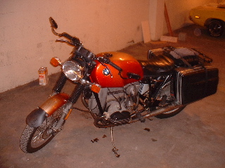 One morning in May 2003 the choke lever broke off in my hand as I tried to start the bike; after a week or two of difficult cold starts, I replaced the entire choke assembly, and shortly thereafter I put on a new clutch cable to ensure smooth, light action. I also ordered a new reproduction dual bench seat from Germany and returned the borrowed original to my R75/7. Then, a month later, I felt strands give way in my front brake cable as I left the house for errands one morning; I was able to drive back home gently before it snapped entirely, and I cannibalized a cable from my 750, already laid up with a leaky master cylinder, until I could replace it with a new cable.