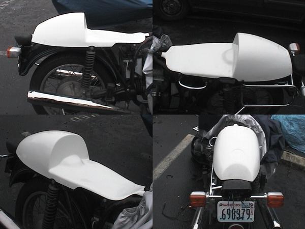 A dual disc brake front end with a machined billet upper triple clamp (for increased rigidity) was mandatory for this project, as was a sleek /5 nacelle-type headlamp bucket with built-in gauges, to complement the long, low lines of the bike. I purchased a custom fiberglass boat tail solo seat and cowl, a nice (if not 100% faithful) replica version of the famous late-70's KnoScher bodywork, from Ed West at 1977-78 stock color for the /7 touring models, eschewing the white pinstripes in favor of solid simplicity. The bike will have black side covers and a black rear fender.