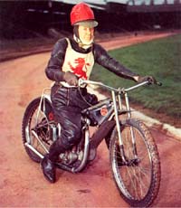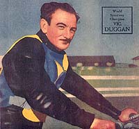 The legend says: 'World Speedway Champion, Vic Duggan'. Though Vic - magnificent as he was - never took speedway's supreme title, he was a five-times Australian champion in a period when engine and distance categories varied. His career, which began at Sydney's Speedway Royale in 1937, was promising from the start. After a short pre-war apprenticeship in England with Hackney, Bristol and Wimbledon, he returned to Britain to ride for Harringay (whose colours he is wearing in this picture) in 1947, sweeping all before him and proving to be sensationally near-unbeatable. The following year he won the equivalent of the world crown by taking the Speedway Riders Championship against the world's best at London's Wembley Stadium. Revered still by those enthusiasts fortunate enough to have seen him ride, he is now in his mid-eighties and lives in quiet retirement in Queensland.