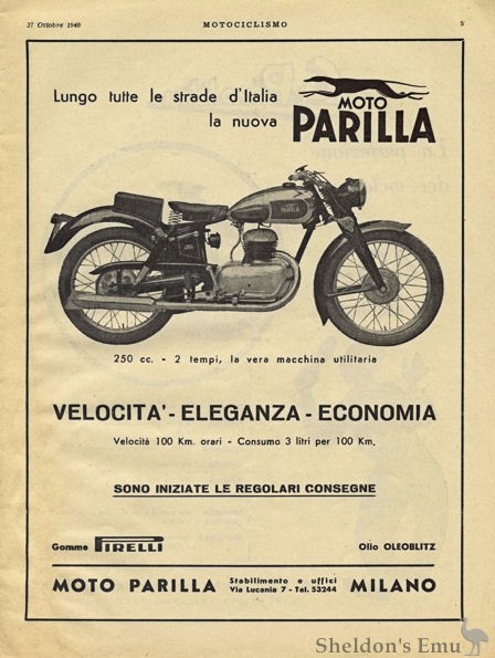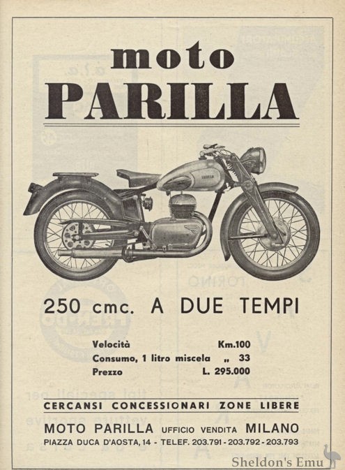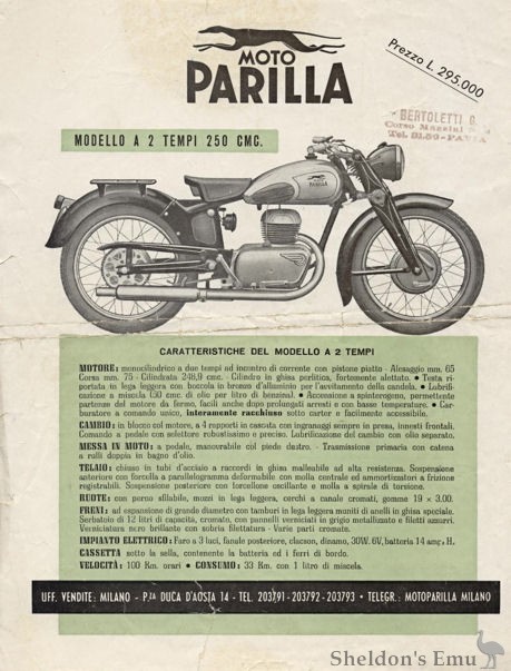 Colors and prices: The early 250's were painted with black or red fenders/frame, a chrome tank with a painted insert. Later bikes followed the same paint scheme as the high-cam models. A price for a 1950 model was 295,000 Lire.