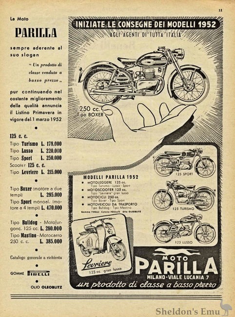 After several years of producing the 250cc OHC bikes, the 250cc, 2-stroke Boxer was one of the first new models offered by the factory in the late 40's. The Boxer is known for its distinctive square case. Several versions of the Boxer were offered. A touring model, a Sport model and a 3-wheel truck (the Mastino) with fan assisted cooling. The Boxer was retired from the model range in 1954.