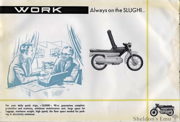 The company was so sure that the Slughi would be such a hit that they produced a 14 page Slughi-only brochure. The brochure states that one go shooting, camping, fishing, to work and spend the weekend on the "most versatile, most desirable of motor vehicles". To see other Slughi manuals, parts books and advertisements, go to our Slughi/Olimpia paperwork page.