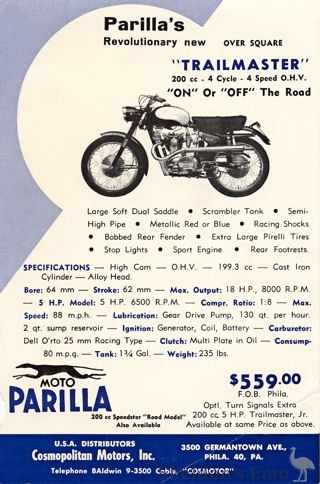 In 1958, the factory started building bikes with it's newly designed angular frame. It was not until the 1960 model year that Cosmo started selling bikes with this frame. The first two models offered by Cosmo was the street/off road Trailmaster scrambler and the 125cc Wildcat. The first year Trailmasters had a 200cc motor installed. It was not until the next model year that Trailmasters had the 250cc motor. Serial numbers range from 410-xxx for early versions with 250-xxx numbers for all later years. Cosmo stopped advertising the Trailmaster in 1963.