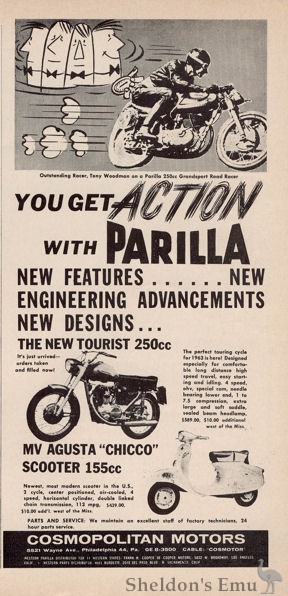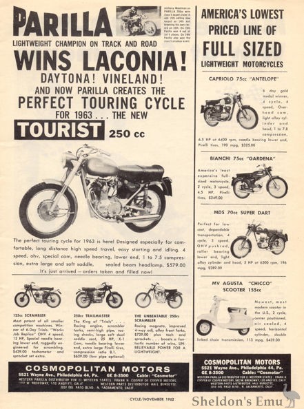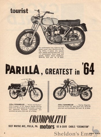 The Tourist was the last Parilla model offered by Cosmo in 1962. It was a street-only bike designed for "comfortable, long distance, high speed travel" (this is Cosmo's description). The motor was a weaker version of the GS motor with a "S" cam. Around 1964, the round gas tank was changed to a more square off version of the GS tank. The Tourist was sold until 1966 when it disappeared off the radar.