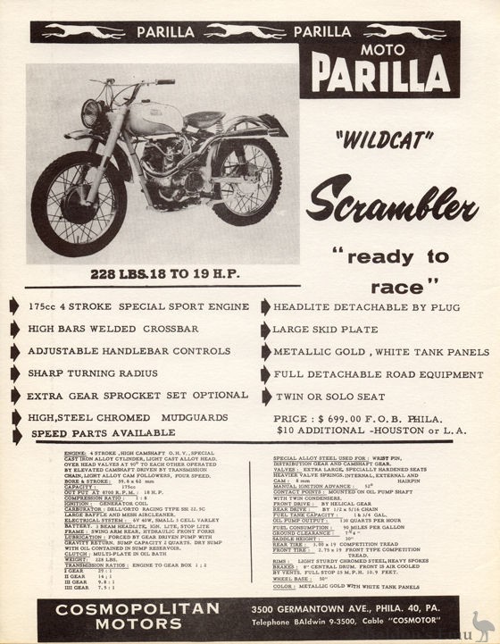 The 175cc Wildcat Scrambler was first introduced to the USA by Cosmo in late 1957. It was a mix of two models. The frame is a modified Speedster (Lusso Veloce) and had a GS motor installed. The Wildcat also used the same 501-xxx serial number series as the GS. The few cycle magazines that tested the Wildcat stated that bike was "very flexible in the dirt" and the motor was "powerful throughout it's rev range". There does not seem to be much information as to whether the Wildcat was used in competition, except for dealer made flyer of Don Droud's accomplishments on a heavily modified version with a 250 engine. In 1959, Cosmo offered a 200cc upgrade of this model as the last version before the 250 Wildcat came out.