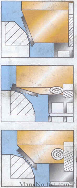 1935 ES2 cylinder head with re-cut valve seats. Thin blue line depicts narrow seat on inlet: to allow maximum gas flow on immediate opening and perfect tick over. Thicker exhaust valve seat helps with dispersal of heat from 'red hot' valve. Easy job by using 'Neway' triple valve seat cutters. First cut is at 60 degrees, second at 31 and final cut (for seat) is at 46. Picture and diagrams demonstrate, click on thumb nails.