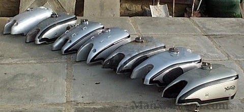 In response to numerous enquiries regarding petrol tank painting; and to save me time on e-mail replies......here are my ideas. beware of the idea of "original". painting of tanks in the pre- and post war period was done by hand and on some days of the week, the hand responded to its brain in slightly different ways. ( I once met an old chap at the isle of man, who actually was a painter at Bracebridge street and he told me this! ) sales literature does not always follow the style that left the factory. some tanks were chrome plated, some were in dull nickel, some were never plated. panels were in silver with black and red lines. in the majority of tanks the red line was inside the black, but occasionally this was reversed!! I would never recommend re-chroming a petrol tank. the amount of pre-plate polishing required to provide a suitable service for chroming, leaves the metal dangerously thin in places and with disastrous consequences!!!!!!