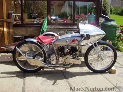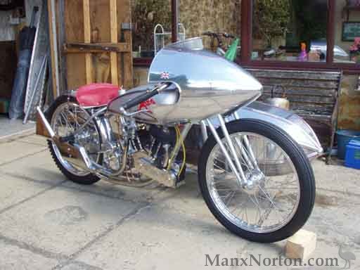 The machine is a special made from a 1920 JAP 1000cc S.V. and a Norton rolling chassis. The nose fairing is from an airplane (I think either Spitfire Mk. 5 or Viscount?).