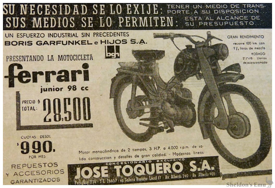 Boris Garfunkel e Hijos was founded in 1913. Formerly of Murovani Kurylivtsi, Podolia (now Ukraine) he had fled the Jewish pogroms in Tzarist Russia with his family. In the 1950s the company entered an agreement with Gilera Argentina SRL to distribute Gilera, and from 1958 until 1965 distributed Ferrari under the BGH Ferrari marque, then based in Buenos Aires.