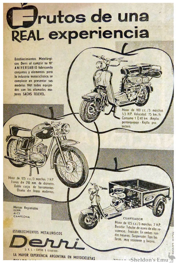Derri SRL was founded in Cordoba in 1950 and began motorcycle manufacture in 1960. The 1961 range had a 125cc motorcycle, 100 and 125cc scooters, and a utility tricycle.