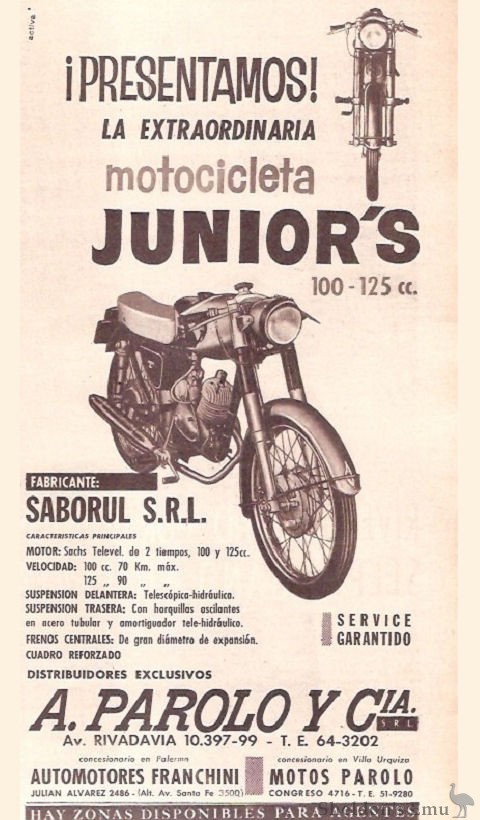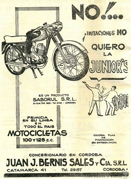 With the lottery winnings, and after partnering with Alberto Abraham Ulfohn (22-23 years old) they founded on 10/12/1958 the company "SABORUL SrL", an acronym derived from the partner's names, with headquarters at 663 Avda. General Paz, Córdoba, dedicated to manufacturing light motorcycles equipped with Sachs single-cylinder engines of 98 and 125 cc, with simple tubular cradle frame, telescopic front suspension, swing arm with 2 hydraulic shock absorbers, drum brakes, capable of 70 and 90 km/h respectively. Assembled during the 1960s, they manufactured up to one hundred units per month.