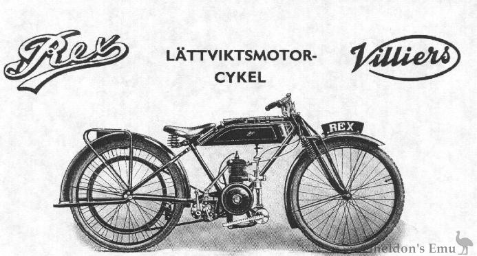 | 1908 släppte Rexfabriken ut sina första Motorcyklar Denna första produkt bör närmast benämnas motorvelociped. Den bestod av en kraftig cykel med fjädrande framgaffel. Drivningen skedde med rem och hade som kraftkälla en 4-takts 1 cylindrig Schweizisk Motosacoche-motor. Det var en populär motor som användes av flera fabrikanter. |