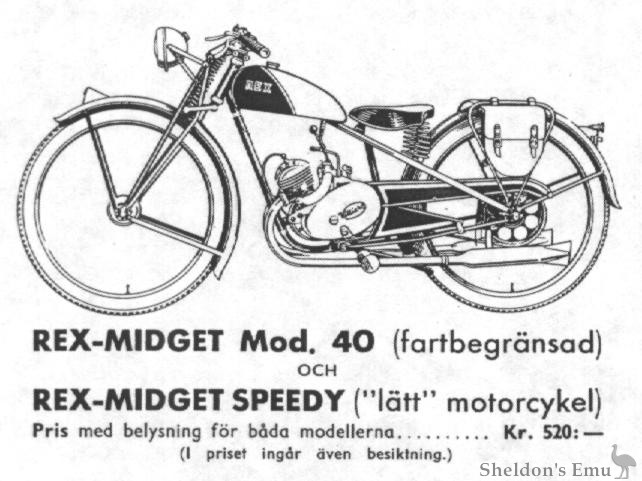 Med Rex Midget Dam introduceras Sveriges första lättviktsmotorcykel,som konstruerats speciellt för damerna. Den är kanske inte fullt så snabb som Rex Midget Sport , men samma styrka och gedigna kvalitet finnes även här. Genom frånvaron av växlingsanordning är denna modell betydligt förenklad till sin skötsel. Pris komplett 1938 Kr. 435:- |