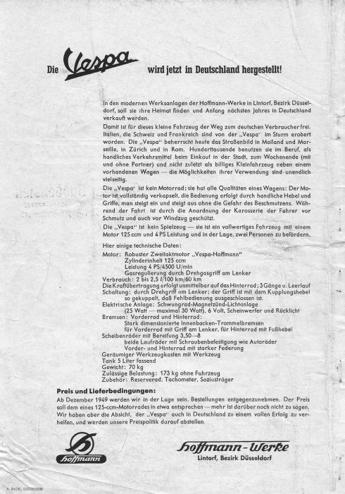 Der folgende Text stammt aus einer Ankündigung der Hoffmann-Werke, die Vespa ab 1950 auf den deutschen Markt zu bringen.