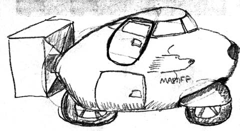 While I was poking around in the mostly gutted fuselage of a Boeing B-17—a half-baked concept that involved its rotating gun turret and a 1975 Hugemobile station wagon was stewing in my mind—Neville found something that resembled a cross between Little Boy and a Dempster dumpster. Upon closer examination, its features, long since camouflaged by a thick growth of wistercias and dandelions, became clearer. The nose of the shell held a busted-out headlight—its gleam in the sunlight had attracted Neville's attention—and soon, with the assistance of a machete borrowed from local cigarette plantation workers and tire irons from the Pit Bull, other features came to light. It appeared to be a cross between a Messerschmitt and a Herkimer Battle Jitney. Smaller than the Herkimer but larger than the Messerschmitt, it had fewer wheels than either: two, to be exact. We found and opened the hatches for the engine compartment. The experimental gas struts had long since become flaccid, so we had to prop the hatches up with the machetes. Imagine our luck when we discovered, tightly squeezed into the generous compartment, what appeared to be the complete engine of what could only be a Spagthorpe War Mastiff! The motorcycle's 16-liter engine was a little monster: six 1800cc pistons and four 1300cc pistons in a complex W arrangement with three heads: one twenty-valve four-cylinder bank in the center flanked by a pair of eighteen-valve three-cylinder banks. The central pistons had five valves each, three intake and two exhaust; while the flanking pistons had six valves each, three intake and three exhaust. These were operated by a complex set of hydraulically actuated valve lifters, with camshafts located two over each cylinder bank and two more in the gullies between banks. Slide rules, HP-32s, and graph paper in hand, Neville and I analyzed the complex valve actuation system. Our analysis was delayed until we traced a set of hydraulic lines associated with the transmission, the carburettors, and the valvetrain up to the pilot's compartment, where they connected to the right-hand grip. The entire engine management system was hydraulically controlled by throttle position! So, assuming a 30-weight oil (multiweight oils not having been invented until after the war, I had to explain to Neville), we concluded that at small throttle openings only the smallest set of intake and exhaust valves would be active (actuated by rocker arms and lifters driven by the gully-positioned camshafts), enabling the engine to idle smoothly and quietly. With increased throttle openings, more intake and exhaust valves would be actuated. Neville and I looked at each other with astonishment: At maximum throttle, this engine should produce about a thousand horsepower!