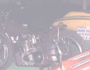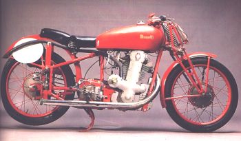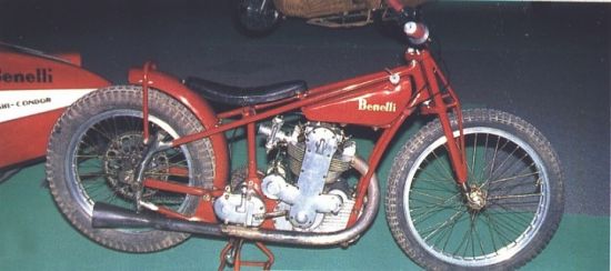 I enclose also a picture of the Benelli 500 TSS owned by the great Dario Ambrosini, (See Below) whose achievements, as a road racer, include a world title and a TT win (sadly, he lost his life at his power's peak in 1951). To tell the truth, the Benelli 500 TSS is a very rare machine, very few copies were produced (the 250cc version was slightly commoner). In the post war years the single-exhaust pipe spare heads, produced by the firm, were bought by riders so as to convert the pre war 'touristic' roadsters (which had two exhaust pipes). Maybe Bon used one of these 'conversions' to power his Benelli 'special'.