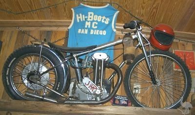 Jim tells us.... "it houses a 5-Stud JAP motor housed in a "Champion" Frame with 26 inch front wheel, 400-18 rear. It ran at Ascot Stadium Los Angles, and throughout Texas. Best of all it's retired, alive and well, and drinks beer with me. The engine is fresh and now and then must still prove to some doubters that she still runs. Light her off on alcohol. A short bump and she breaths fire and let's you know it still thumps with that great Jap signature"....