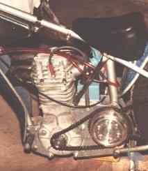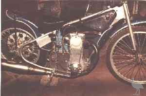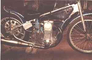 This frame used 2 small tubes just above the fuel tank instead of the single big tube seen on almost every normal speedway frame. Over the 2 tubes on a Flexyflyer is a clamp that you can adjust (by sliding it forwards or backwards) and therefore change the stiffness of the frame.