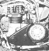 LEFT:The MK2 non-unit construction Engine. Note the centrally mounted carb on this particular engine. It is worth mentioning at this point about the Frames that Maely built for his machines of which there were also two types. The early frames were silver with the tank, fenders and air box painted gold with black trim and were designed to house either the "Maely" or "JAWA" engines whilst some later MK1 machines had silver frames with medium blue body work. The second type of frame designed by Maely was the Maely "Flexyflyer".