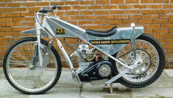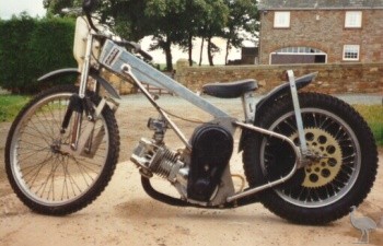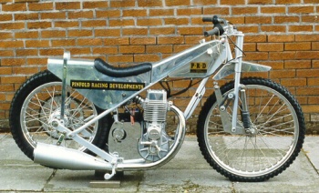 In 1989/1990, Paul Pinfold from Coventry designed a revolutionary speedway frame, the first to challenge the traditional "diamond" for over 40 years. In Pinfold's design, the top 2 tubes of the frame go from the headstock, widening out past the centrally mounted card to be fixed to the rear arm.
