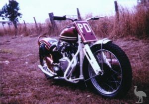 The carburettor is an AMAL TT, no air cleaner, but just a simple bend from a radiator hose instead. The tracks in those days were always wet and had no dust