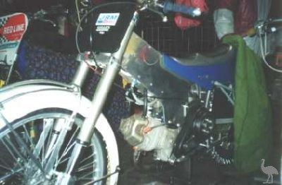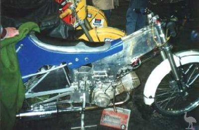 A monocoque frame is not new for Dirt Track bikes, other models that have used such a frame include the Killmeyer Apfelbeck machine that was used in speedway way back in the early fifties. Other machines that used this sort of frame were the British built Fictitious longtrack bike of the mid eighties and more recently, Stefan Danno built a speedway machine with a monocoque frame in 1999.