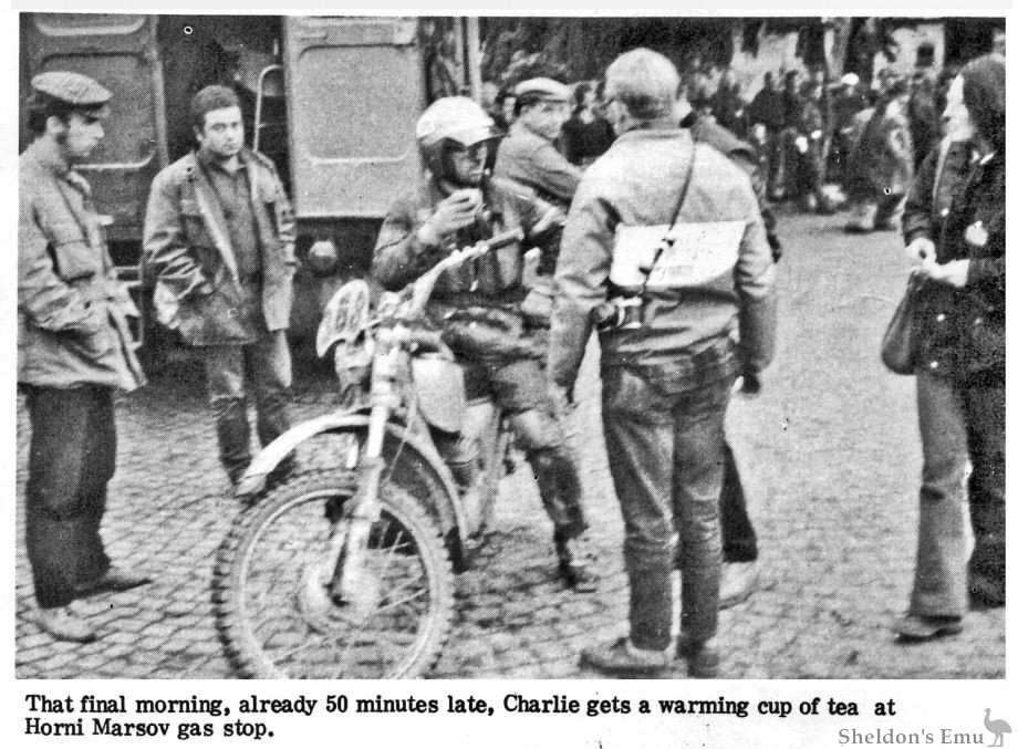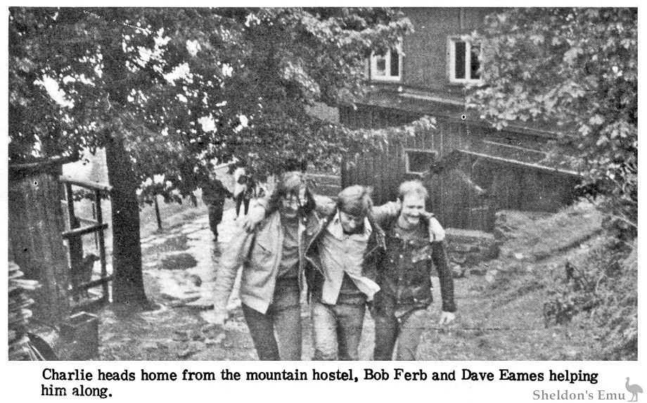 Over a narrow planked bridge, edging along over ledges and mud, I became slowly aware that this luxury car (by Czech standards) was a marvel off the road. Never any wheelspin, those fat little radial tires up front just wrapped themselves around each outcrop, over each muddy hump, and clawed on. Finally our guide motioned me to stop. A steep trail led to our left downhill, and the roof of a small hostel showed through the grey mists. Charlie was down there.