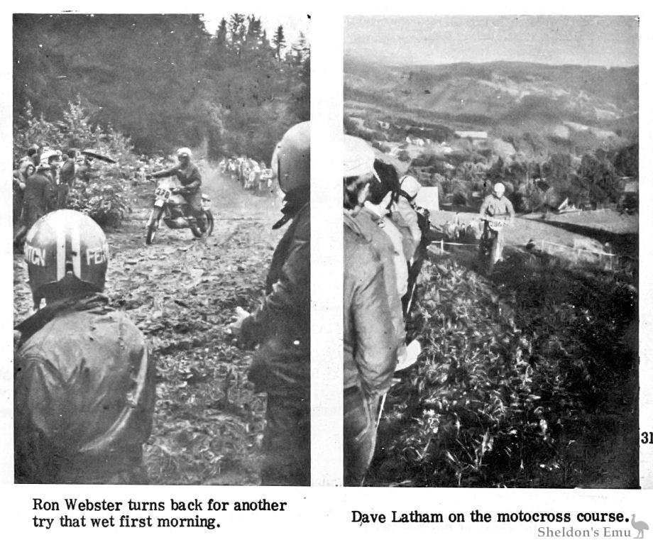 The AMA nominally led the U.S. contingent. Ed Youngblood did yeoman service throughout the stay keeping the many hassles and paperwork details straight. Russ March presumably represented us well in the Jury meetings, since ordinary folk do not get to go to these affairs, we must draw this conclusion from the lack of any adverse circumstances arising from the Jury. Don Woods and Dave Welch sort of circulated around, seeing how it all happened, Woods ostensibly overall manager of the U.S. effort, but in fact more of an observer, sort of let A1 Eames take the responsibility for the dozen or so unsupported (by factory people) riders. These included our Yankee and Ossa riders, so the Yankee people got together with other U.S. onlookers to supply the entire dozen with fuel and refreshment. Particularly helpful were the Webco group. Tom Heininger, who is president of the Motorcycle Industry Council, and members of his family, worked all week at gas stops, and their stop was generally regarded as the neatest one by all the riders they served.