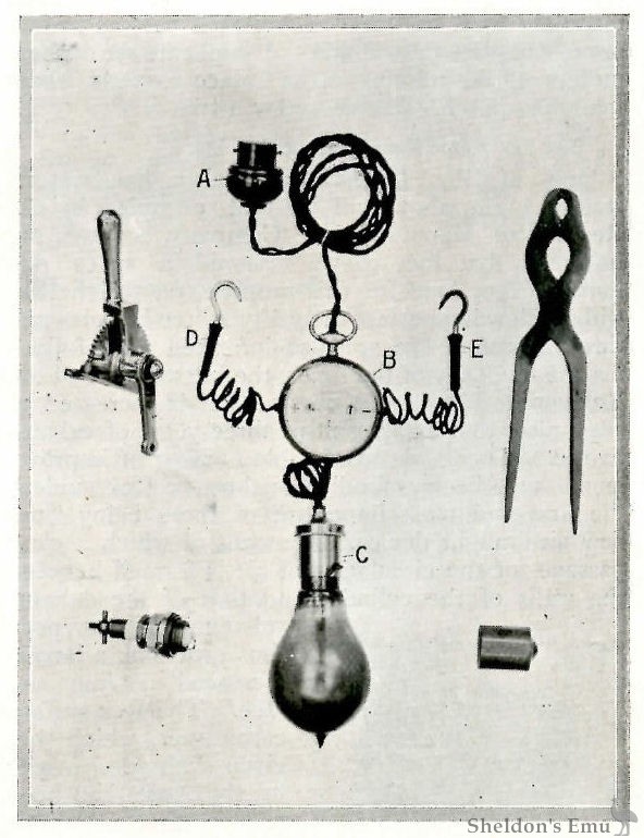 Messrs. G. T. Riches, although not exhibiting at the Show, are now selling an accessory which should be useful to those motor cyclists whose houses are supplied with a continuous electric current, and which we illustrate herewith. This is known as aHome-charger. It consists of a plug A, which fits into an ordinary electric lamp holder. From the plug the wires go through a pole detector B, which in its turn passes through the lamp C. Thence the wires D and E, which are coloured red and green, go to the accumulator. The whole apparatus packs into a neat box about 3m. square. It is impossible to connect up the accumulators wrongly. On the same illustration will also be seen a notched quadrant with spring catch, a very handy pair of pliers, and anew pattern sparking plug.
