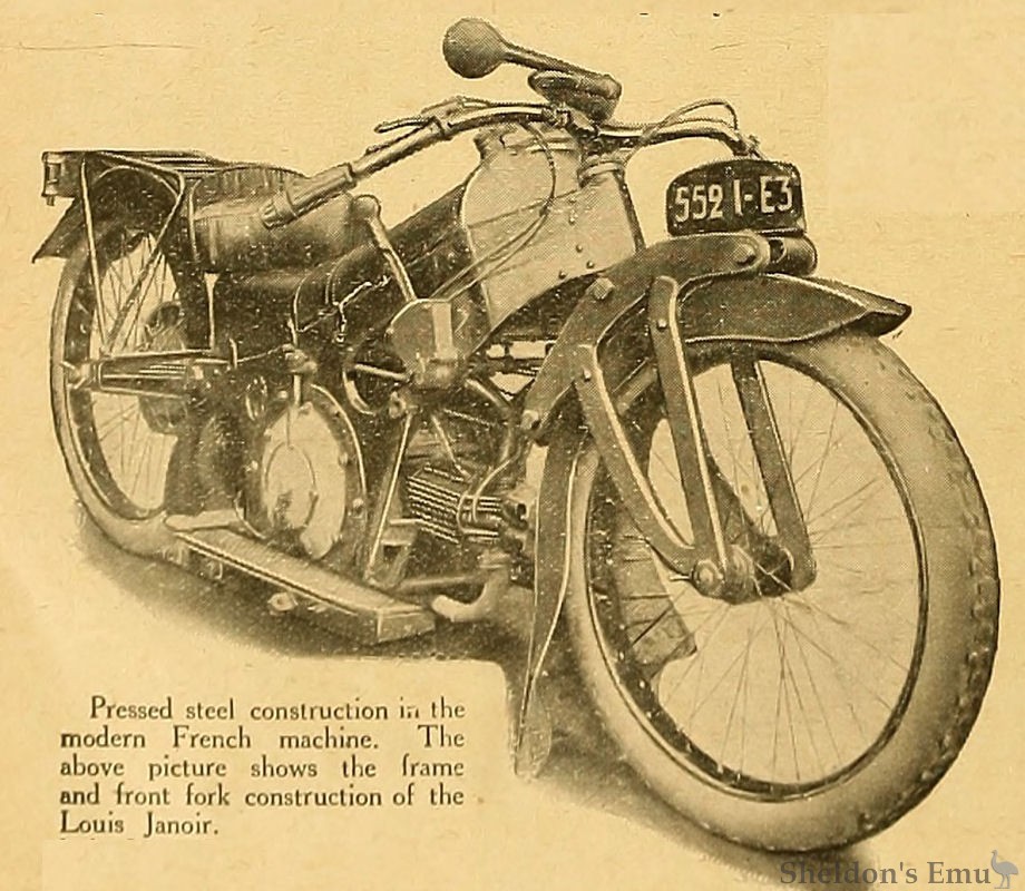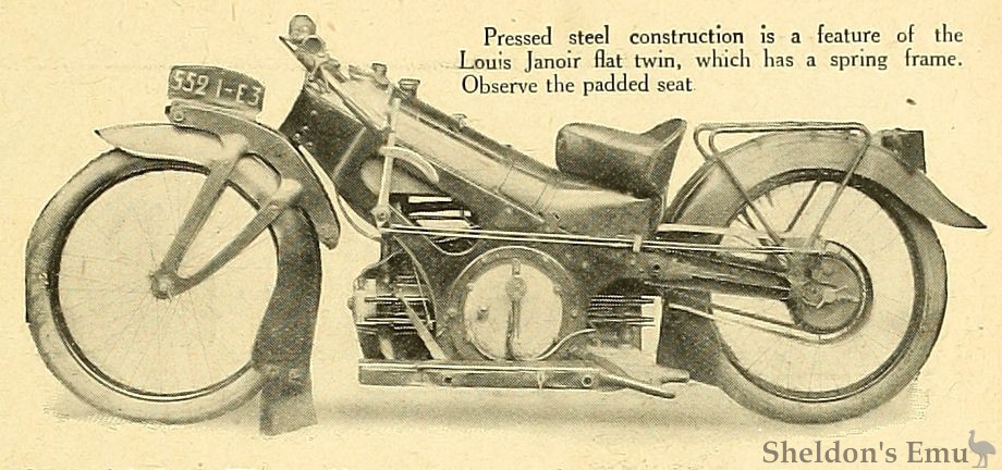 Pressed steel construction is a feature of the Louis Janoir flat twin, which has a spring frame. Observe the padded seat.