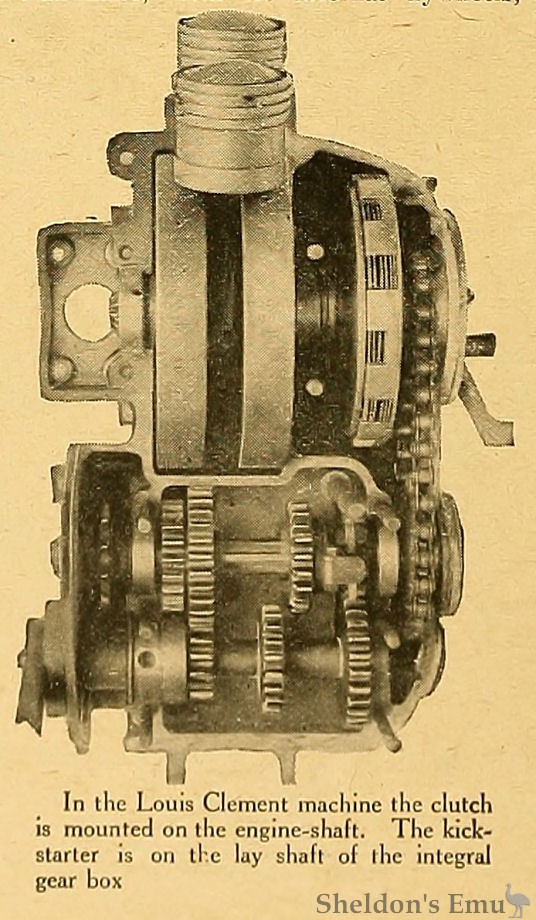 In the Louis Clement machine the clutch is mounted on the engine-shaft. The kick-starter is on the lay shaft of the integral gear box.
