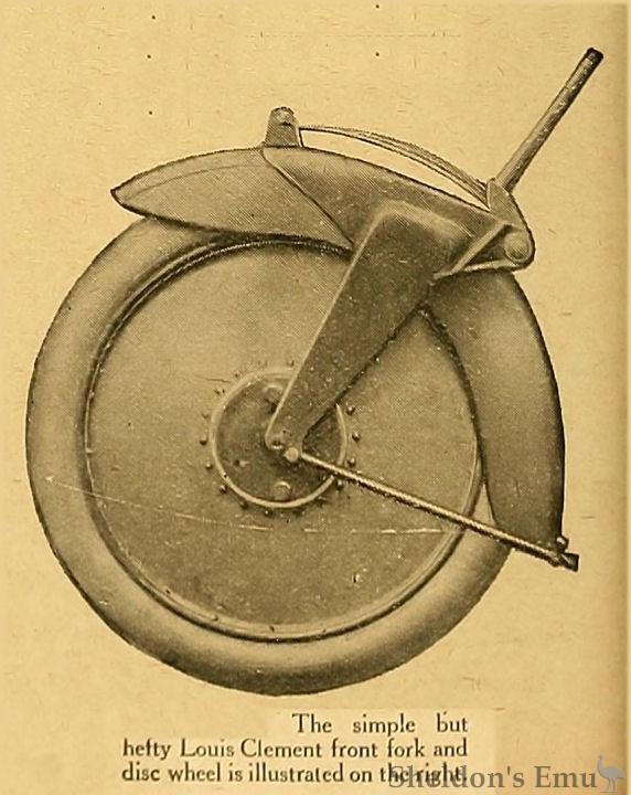 The simple but hefty Louis Clement front fork and disc wheel is illustrated on the right.