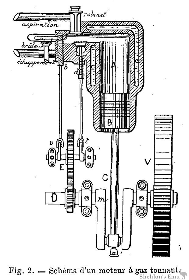 Sur quatre courses du piston, il n’y en a donc qu’une seule où se produise un effet utile, une impulsion motrice, et c’est pourquoi on a été obligé d’intercaler, sur l’arbre de couche auquel est transmis l’effort du piston, des volants ayant pour effet par leur inertie d’accumuler le mouvement et de l’entretenir pendant un tour et demi, l’action efficace ne s’opérant que pendant un demi-tour sur deux tours. Les soupapes d’admission et d’échappement sont commandées, comme le montre la fig. 2, par des tiges etdes cames, ces dernières faisant un tour pour deux tours de l’arbre moteur auquel elles sont reliées par des engrenages.