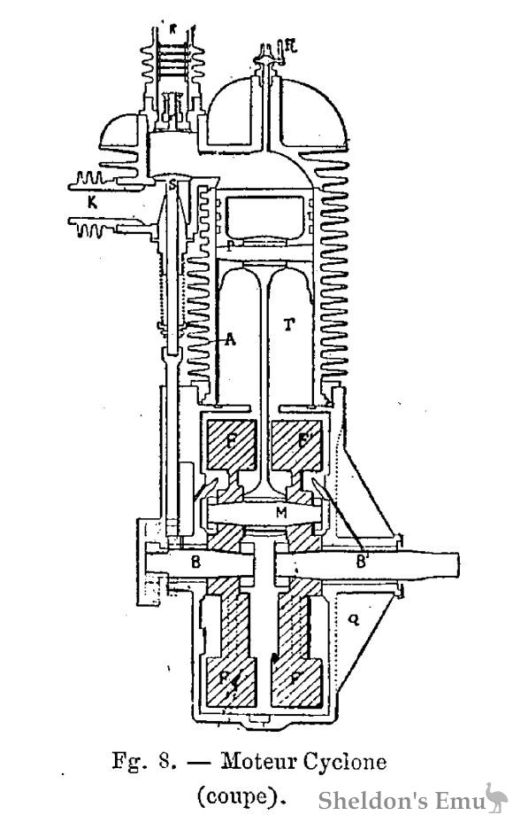 Moteur « Cyclone ». O’est une machine à deux cylindres accolés sur un carter en forme de tambour. La fig. 8 montre une coupe transversale par l’un des cylindres. La bougie est placée comme dans le modèle précédent, mais les soupapes sont disposées dans une chambre spéciale sur le côté du cylindre et commandées par les moyens ordinaires.