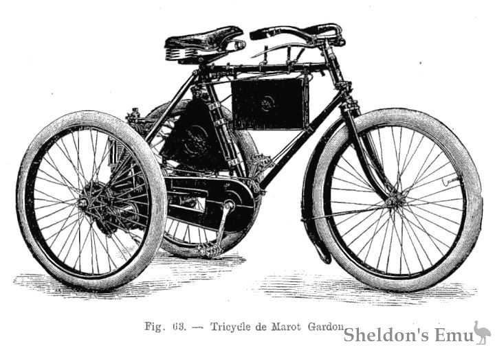 Marot Gardon tricycles. — These motorcycles are of impeccable construction, made from top quality materials and mounted with great care, so they are much appreciated, due to their sturdiness and functionality. The general arrangement is that of De Dion's tricycle, but with more elegance and finish. All moving parts are protected; guy ropes prevent any bending from the rear axle, the whole gives an impression of solidity, and the controls are well grouped. These machines have proven their worth and endurance in many races where they have honorably appeared, notably in the famous Paris-Amsterdam-Paris race and the 1898 Motorcycle Cup.