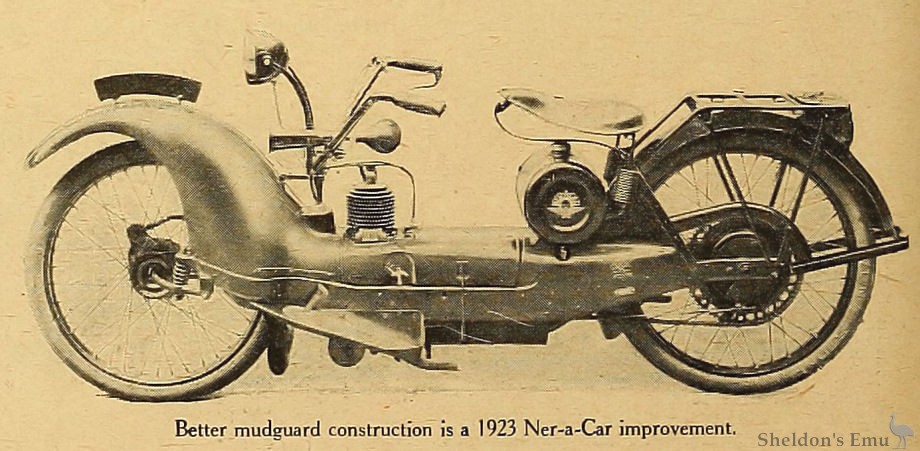 Stand 31.When the Ner-a-car was first introduced its sponsors would not admit that it was a motor cycle at all. Perhaps it is not; but nevertheless, it finds its way into the Motor Cycle Show and appeals to quite a number of motor cyclists, as well as to the car-owner or non-motorist clientele which it was designed to attract. Its general lines are now too well known to need detailed description; suffice it to say that it is extremely low built, and almost self-steering and non-skidding. For 1923 its two-stroke power unit has been increased in capacity from 211 c.c. to 285 c.c.
