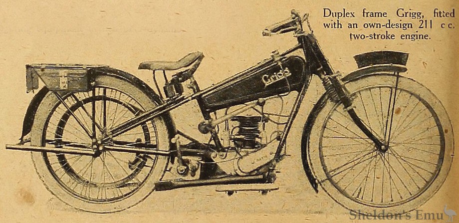 Stand 35.Grigg lightweights are considerably more attractive than their name. Three models will comprise the 1923 programme : (1) a . duplex frame machine with a 347 c.c. Villiers engine, (2) a similar model with a 211 c.c. Grigg two-stroke engine, and (3) an o.h.v. four-stroke 181 c.c. miniature.