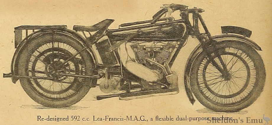 Two models only are specialised on, both being fitted with V twin M.A.G. engines, and both suitable for solo or sidecar work. Although the two are alike in some respects, they differ considerably in specification. The smaller (495 c.c.) machine has a Lea-Francis three-speed gear box, Druid forks, and 26x2½in. tyres, while the larger (592 c.c.) has a Burman gear box, Brampton forks, and 26 x 3in. tyres.