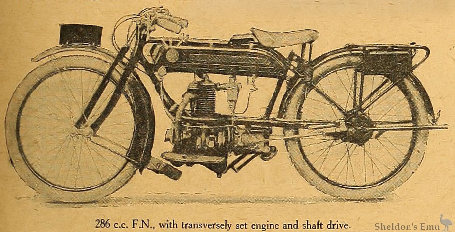 Stand 141.Built in one of the largest continental small-arm factories, F.N. products are famed for their excellent design, good material, and lasting qualities. The 748 c.c. four-cylinder is a machine which is built entirely on car lines, equipped with an engine which was entirely re-designed last year, and includes the very latest car practice, such as overhead inlet valves and mechanical lubrication. The single-cylinder 286 c.c. model, the engine of which is placed across the frame, also has propeller shaft transmission, and remains unaltered.