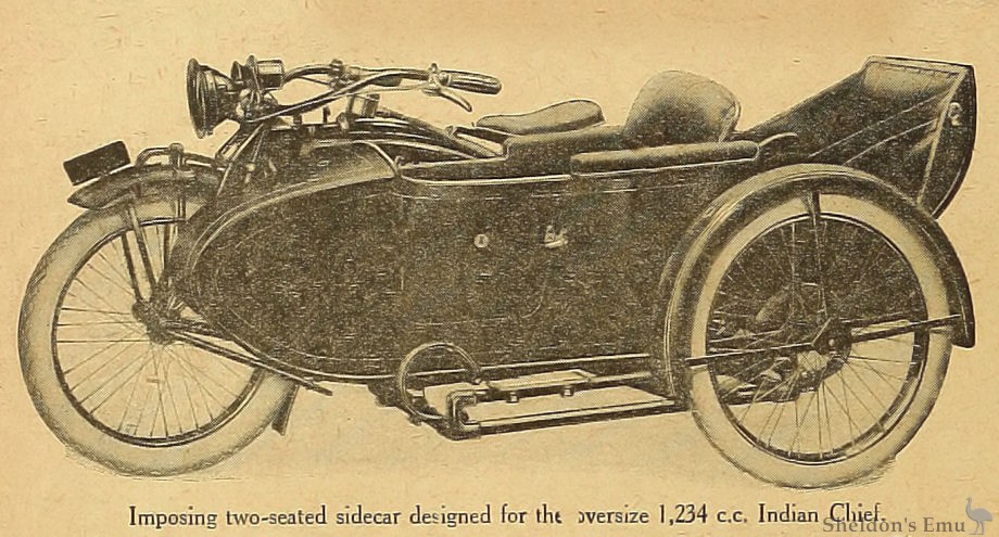 82.5x112.6 mm. (1,234 cc); twin cyl. four-stroke; side valves; mechanical lubrication: Schebler carb.; chain-driven mag.; 3-sp. gear; clutch and kick-starter; chain drive; 23x3in. tyres. Price: Solo, £137; with Sidecar, £167.