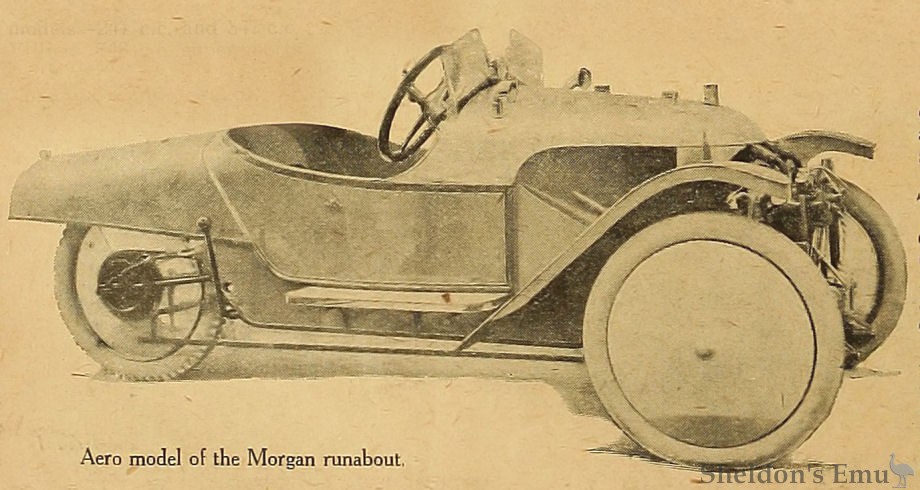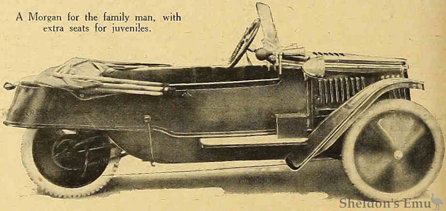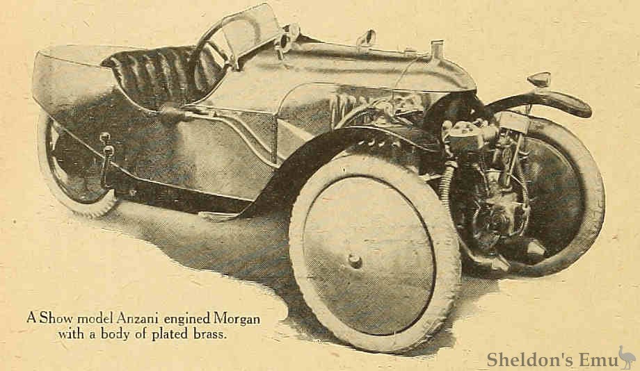 The range of Morgan models is wide enough to meet the requirements of all classes of three-wheeler enthusiasts. For £128 there is offered the standard model fitted with either an air-cooled J.A.P. or Blackburne engine, whilst for £30 more the family Morgan can be had, which will accommodate two extra passengers in the rear seats. This model specially attracts the family man, for the accommodation provided is far more commodious than might be imagined on so small a chassis. Speed men can be accommodated with the Grand Prix model at the reduced price of £160, and at these figures full equipment is, of course, included. One of the most interesting exhibits on the stand is the chassis so familiar to many and still fascinating in its admirable simplicity. No change of design is made this year, and, indeed, judging by the continued success of the Morgan, alike in the hands of private owners and in trials, little change is needed.