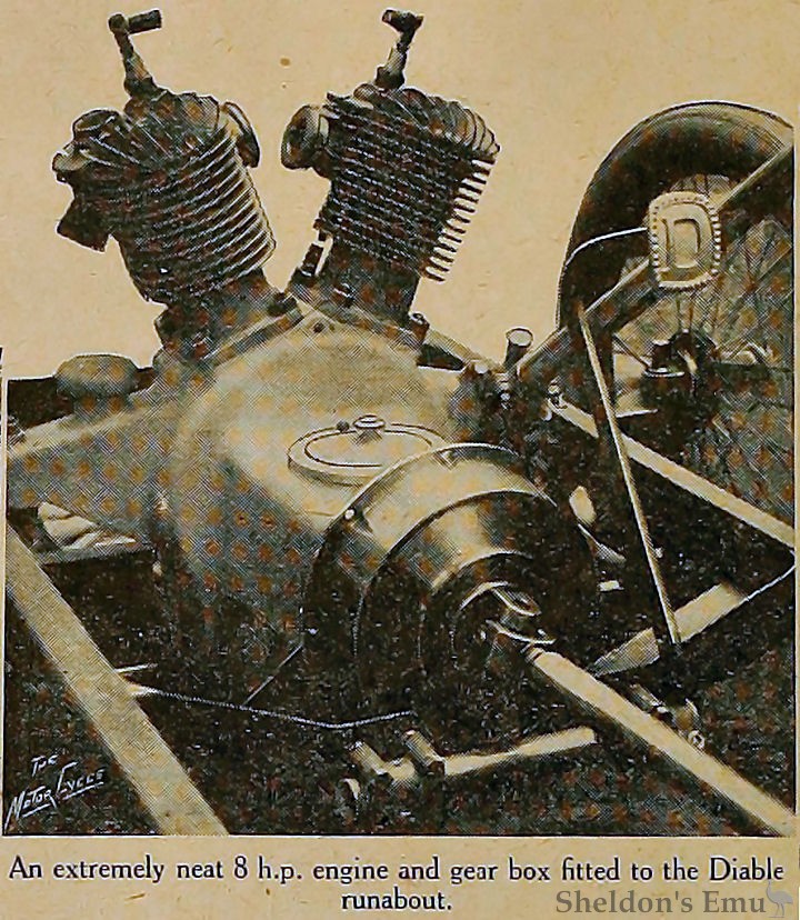Possibly the neatest and most practical three-wheeler in the exhibition is the Diable, which is fitted with a remarkably clean looking 8 h.p. air-cooled V type engine...