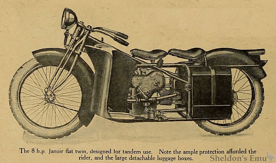 The 8 h.p. Janoir flat twin, designed tor tandem use. Note the ample protection afforded the rider, and the large detachable luggage boxes.