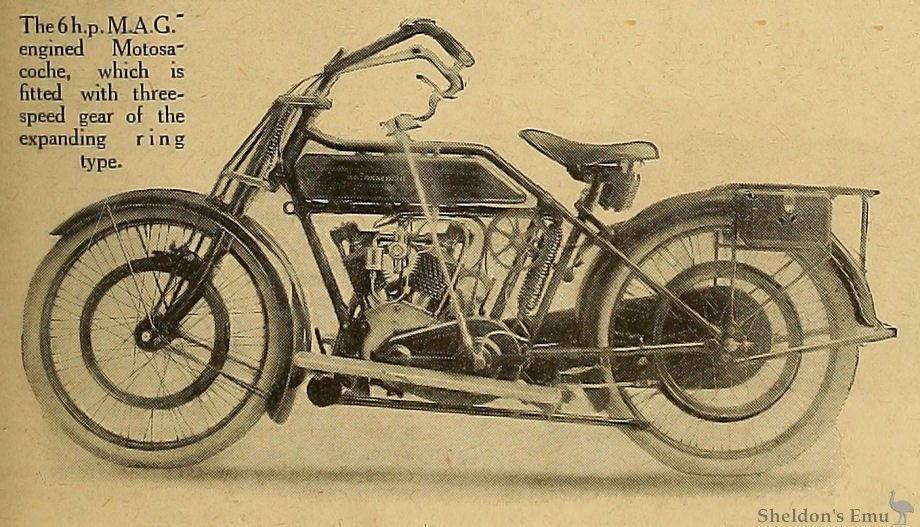 Our readers need no introduction to the Motosacoche either as regards its leading features or the excellence of its workmanship. There are, however, some interesting details incorporated in the new models, the chief of which lies in the new three-speed gear. This gear is similar to the Enfield two-speed in general layout ; there are, however, three primary chain drives and three expanding clutches, the adjustment for each of which is independent and easily accessible...