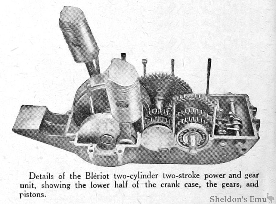 Details of the Bleriot two-cylinder two-stroke power and gear unit, showing the lower half of the crank case, the gears, and pistons.